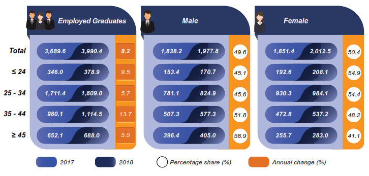 Employed graduates in skilled category accounted for 73.8 per cent (2,945.7 thousand persons) in 2018 where the highest share was in the Professionals occupation category with 45.3 per cent (1,809.4 thousand persons), followed by Technicians and associate professionals at 19.0 per cent (759.3 thousand persons).