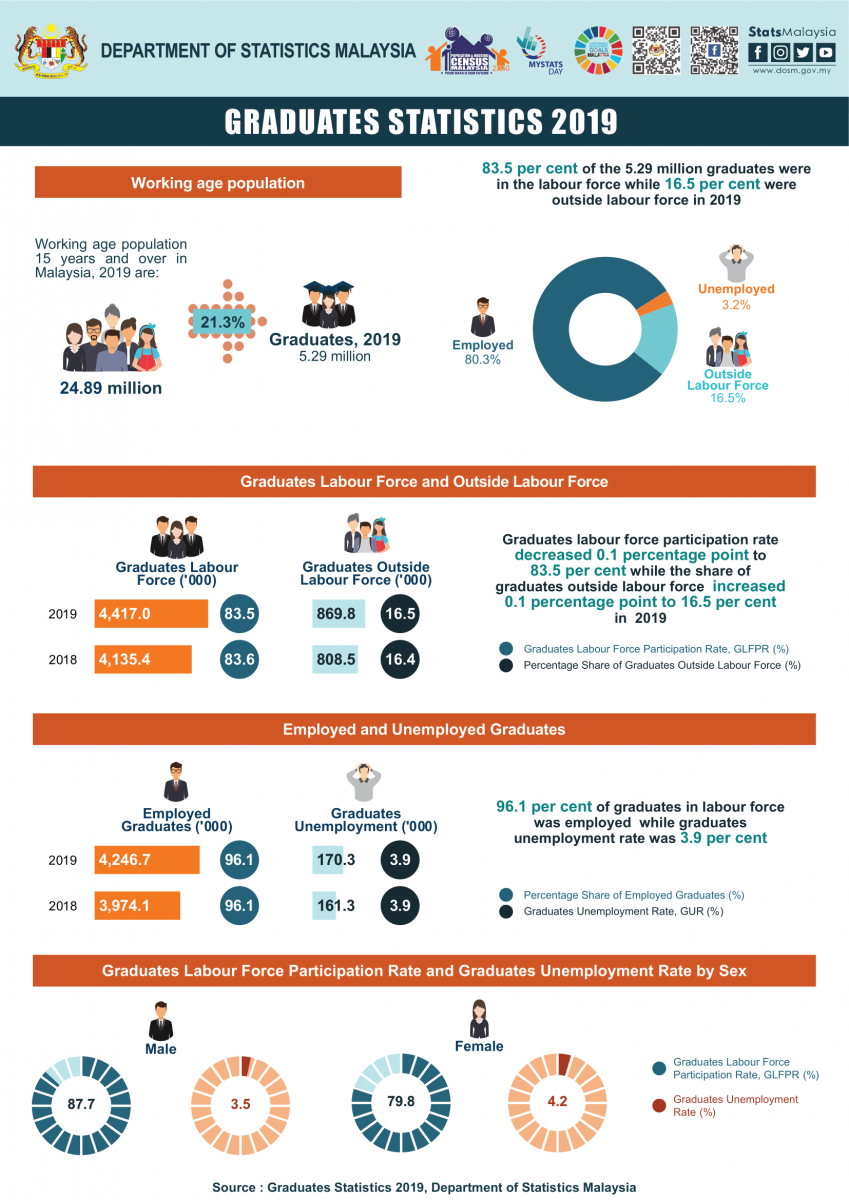 This report presents statistics on graduates for the period of 2016 to 2019. The statistics was based on compilation of various data sources namely Labour Force Survey, Higher Education Statistics and Graduate Tracers Study. In this report, graduates are defined as individuals aged 15 years and over with the highest certificate obtained from universities, colleges, polytechnics, recognised bodies or equivalent, in which the duration of study is at least two years. Graduates are classified into two categories of certification namely Diploma and Degree.