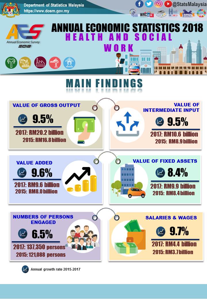 The health and social work services generate gross output value of RM20.2 billion in 2017 compared to RM16.8 billion in 2015 with the annual growth rate value of 9.5 per cent. In tandem with the performance of gross output, the value of intermediate input also increased by 9.5 per cent to record RM10.6 billion, thus resulting a value added of RM9.6 billion for the year 2017.