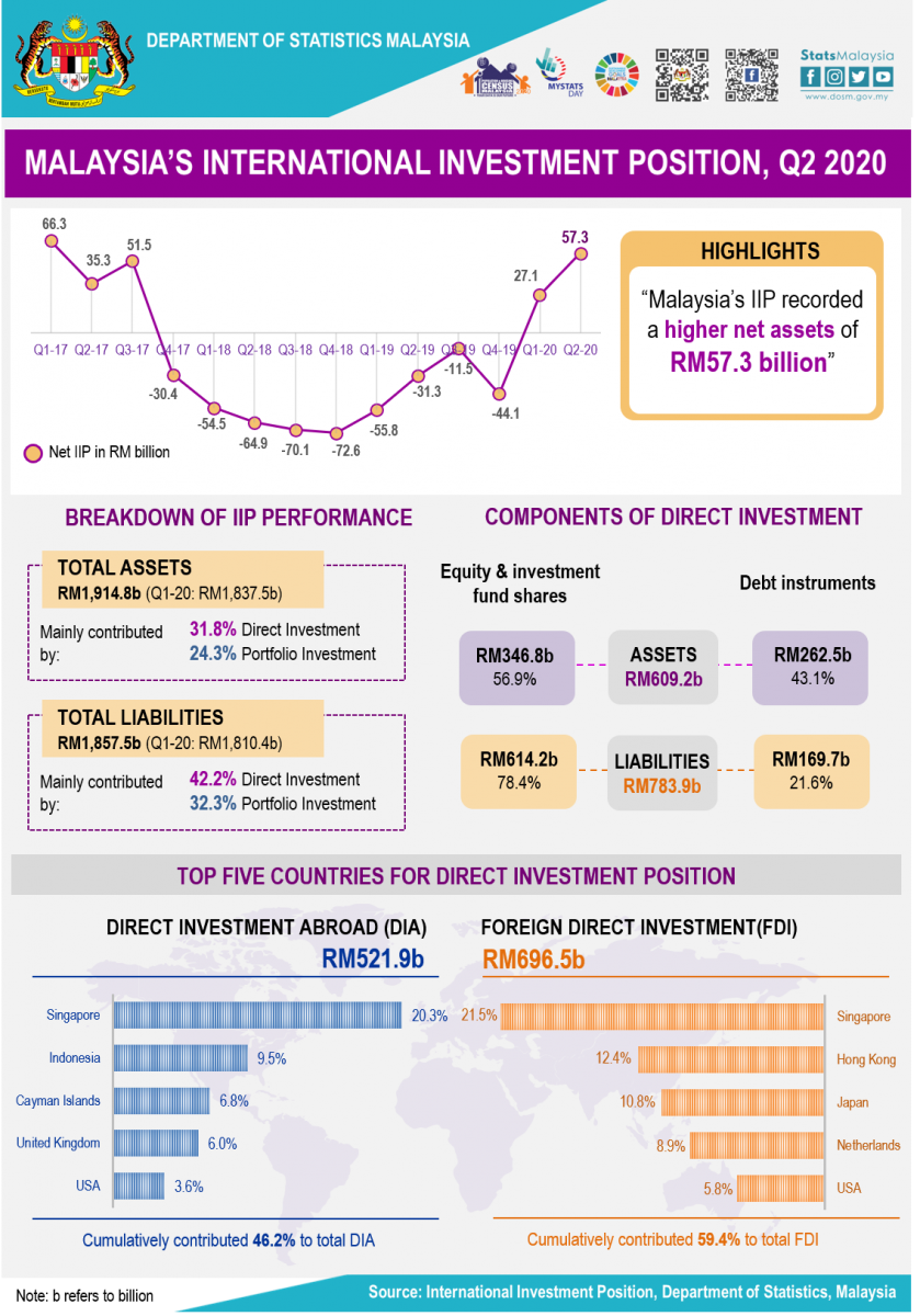 As at end of second quarter 2020, Malaysia’s international investment position (IIP) recorded a higher net assets position of RM57.3 billion as against RM27.1 billion in the last quarter. Total financial assets increased by RM77.4 billion to post RM1,914.8 billion, while total liabilities recorded a value of RM1,857.5 billion (Q1 2020: RM1,810.4 billion).