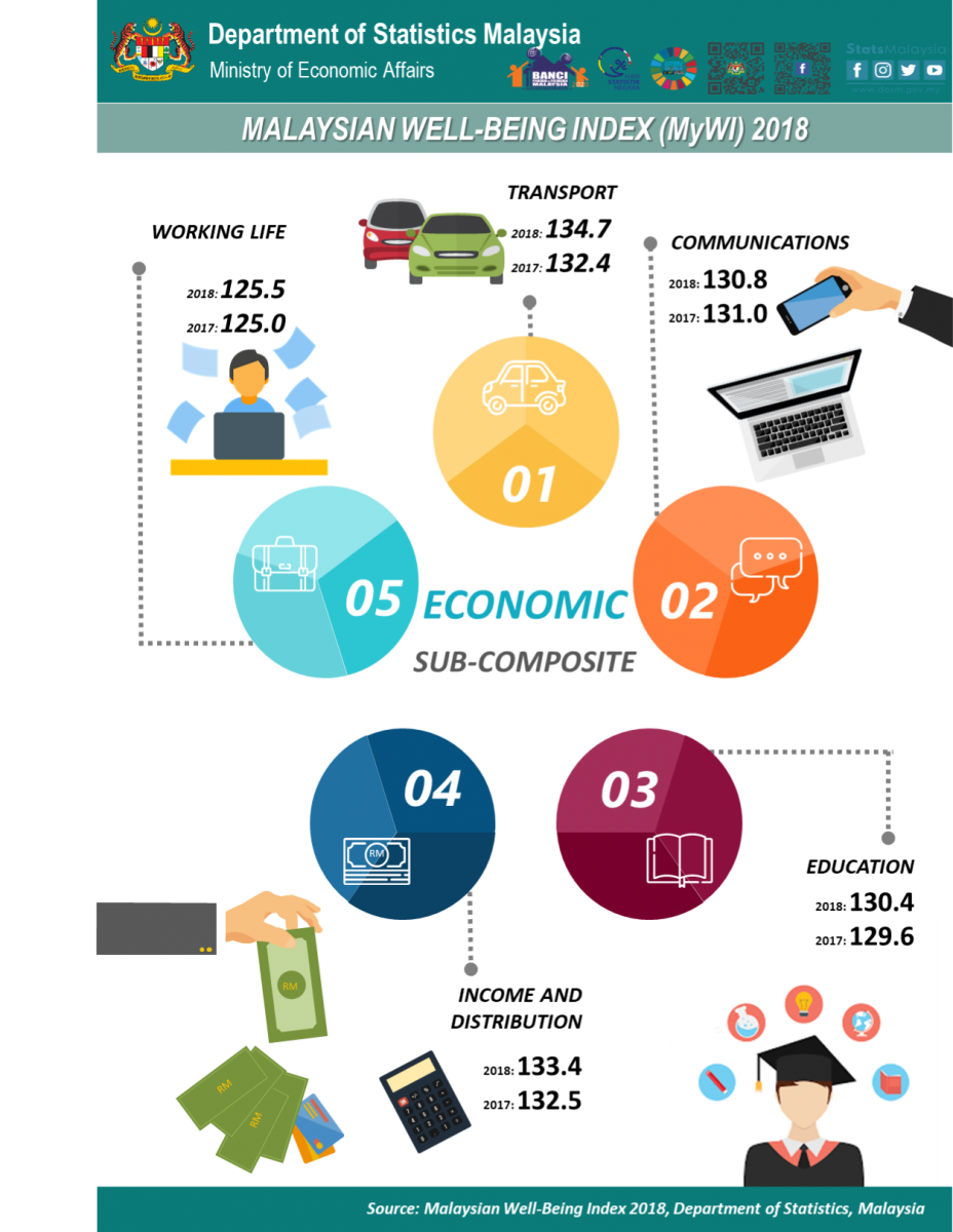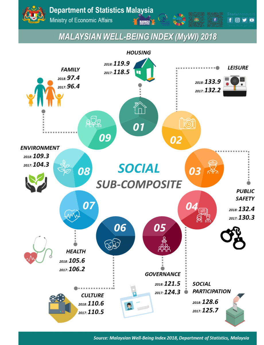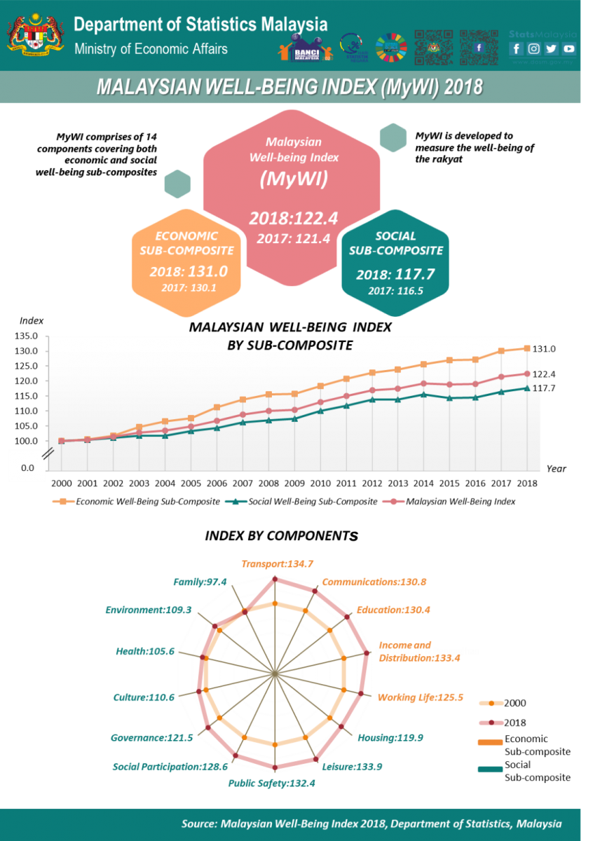 Malaysia Well-Being Index (MyWI) is an overview of the people's well-being using 14 components covering economic well-being sub-composite and social well-being sub-composite.