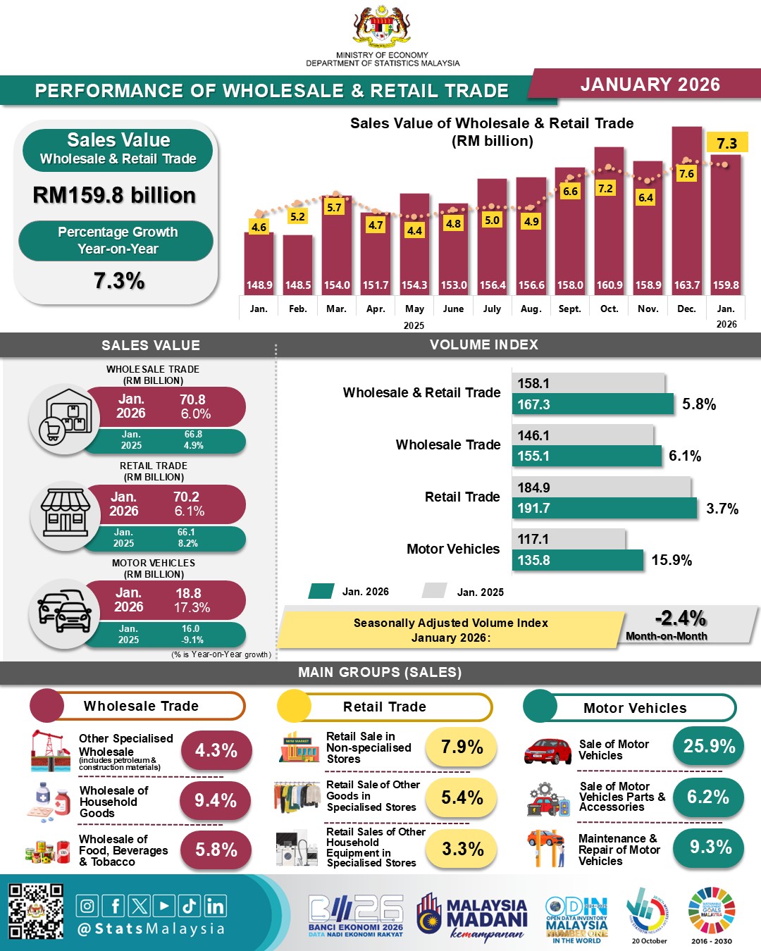 Sales value of Wholesale & retail trade recorded RM159.8 billion in January 2026, grew 7.3 per cent year-on-year. The positive growth was contributed by all sub-sectors, namely Motor vehicles 17.3 per cent, Retail trade 6.1 per cent, and Wholesale trade 6.0 per cent. Meanwhile, for month-on-month comparison, sales value decreased -2.4 per cent.