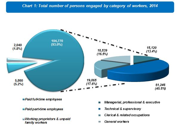 For paid full-time employees, technical and supervisory recorded the highest total number of persons engaged of 51,246 persons (45.5%) followed by category of clerical and related occupations (17.6%), general workers (16.5%) and managerial, professional and executive (13.4%) (Chart 1).