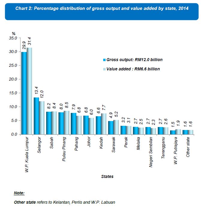 The highest gross output and value added were recorded in W.P. Kuala Lumpur with RM3.6 billion (29.9%) and RM2.1 billion (31.4%). The second highest was registered by Selangor with gross output of RM1.6 billion (13.4%) and value added, RM0.8 billion (12.0%). This was followed by Sabah, with the gross output RM1.0 billion (8.2%) and value added was RM0.6 billion (8.4%) as shown in Chart 2.