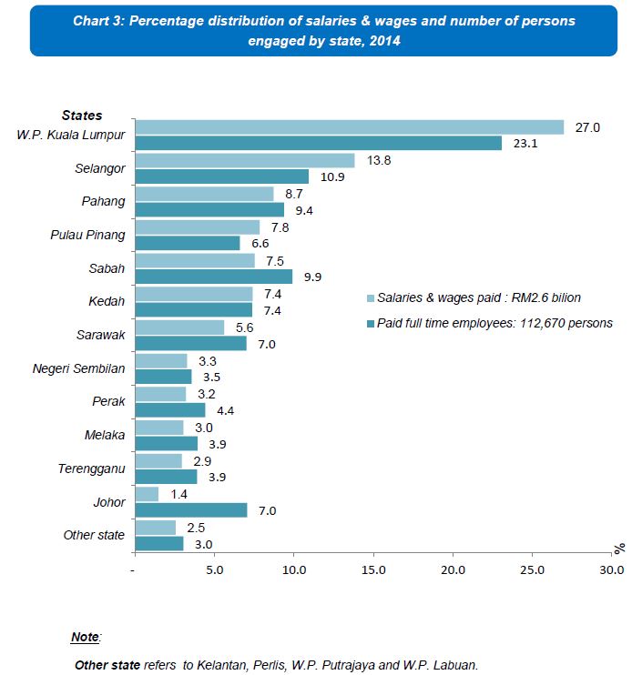 In terms of salaries & wages and number of paid employees in 2014, W.P. Kuala Lumpur registered the highest salaries & wages paid and number of workers, 27.0 per cent and 23.1 per cent respectively. This was followed by Selangor with the salaries & wages, 13.8 per cent and 10.9 per cent for the number of persons engaged (Chart 3).