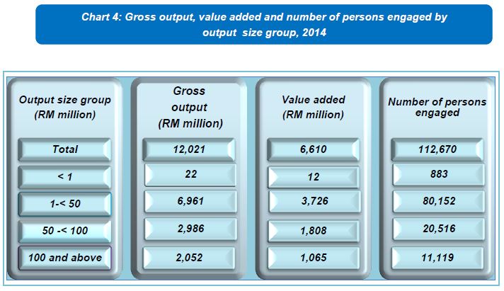 Establishments with gross output of RM1 million to RM50 million was the main contributor with RM7.0 billion (57.9%) and value added RM3.7 billion (56.4%) for reference year 2014. The lowest contribution in terms of gross output and number of persons engaged was registered in the output size group of establishment less than RM1 million as shown in Chart 4.
