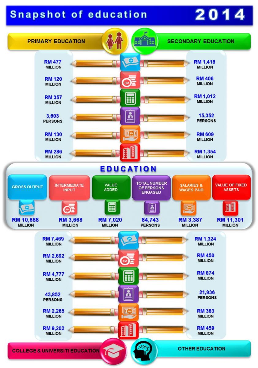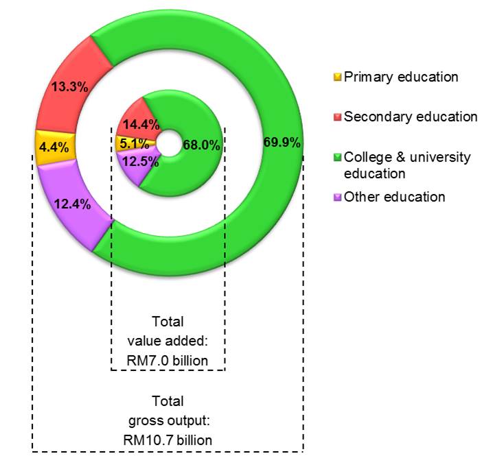 In terms of gross output, college & university education registered the highest value of RM7.5 billion (69.9%) to the total. This was followed by secondary education of RM1.4 billion (13.3%), other education of RM1.3 billion (12.4%) and primary education with gross output of RM0.5 billion or contributed 4.4 per cent.
