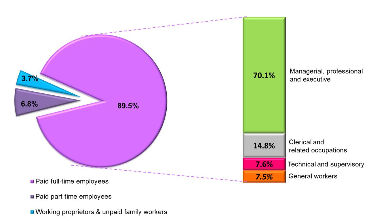 Out of the total number of paid full-time employees, managerial, professional and executive category constituted the highest number with 53,137 persons (70.1%) followed by clerical and related occupations of 11,183 (14.8%), technical and supervisory of 5,776 (7.6%) and general workers of 5,719 (7.5%) as shown in Chart 2.