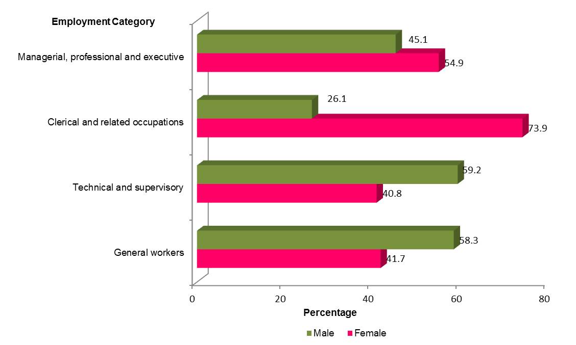 For paid full-time employees, number of female workers was higher than male workers for managerial, professional and executive category (female: 54.9%; male: 45.1%) and clerical and related occupations (female: 73.9%; male: 26.1%). Nevertheless, for technical and supervisory category as well as general workers, male workers were more than female workers with share of 59.2 per cent and 58.3 per cent respectively (Chart 3).