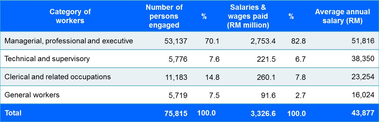 For salaries & wages paid by category of workers, the managerial, professional and executive received the highest average annual salary & wages of RM51,816 while the second highest (RM38,350) was received by technical and supervisory category. This was followed by clerical and related occupations (RM23,254) and general workers (RM16,024). Table 1 shows average annual salary & wages by category of workers.