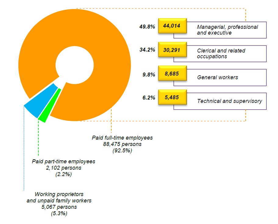 In terms of number of persons engaged by sex, female workers dominated this sub-sector with 70,827 persons (74.1%) as compared to male workers with 25.9 per cent. It was observed that female workers outnumbered male workers for paid full-time and paid part-time employees. For paid full-time employees, the number of female workers was higher than male workers in managerial, professional and executive (female: 33,824 persons; male: 10,190 persons) as well as clerical and related occupations (female: 27,359 persons; male: 2,932 persons) as illustrated in Chart 3.