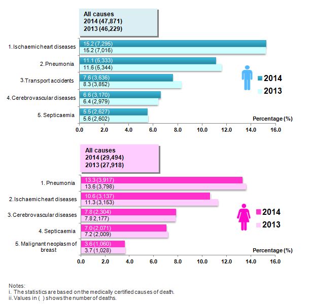 The number of deaths due to ischemic heart diseases recorded the highest percentage for males (15.2%). Meanwhile, the number of deaths due to pneumonia recorded the highest percentage for females (13.3%). However, the ranking of the five principal causes of death for males and females in 2014 remained unchanged from 2013.