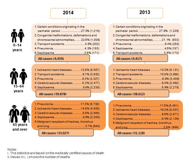 In the same year, the number of deaths due to pneumonia recorded the highest percentage among the population aged 65 years and over (17.3%). However, this percentage declined by 0.2 percentage points as compared to 2013 (17.5%).