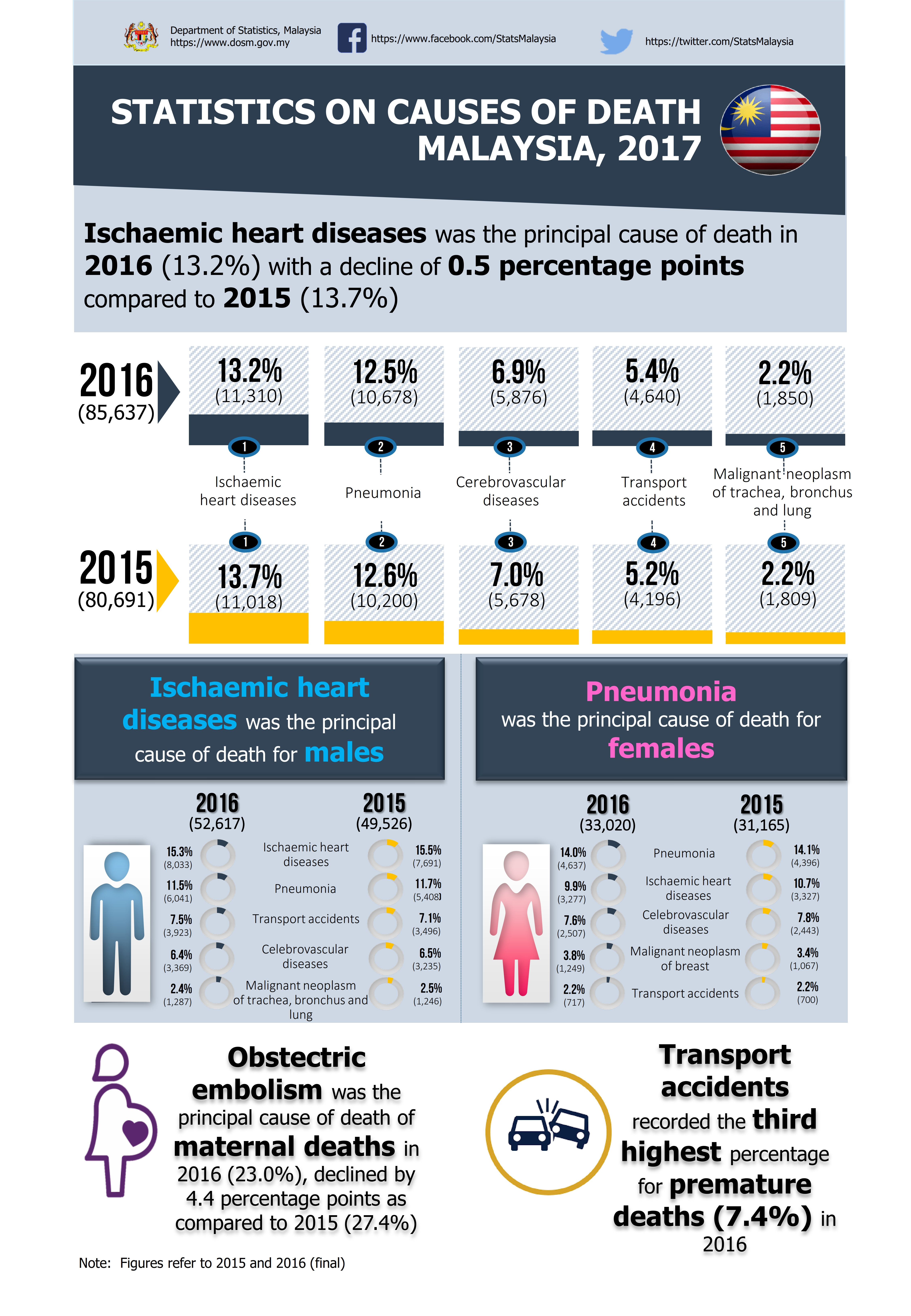 In 2016, deaths due to ischaemic heart diseases recorded the highest percentage for males of 15.3 per cent, followed by pneumonia (11.5%), transport accidents (7.5%), cerebrovascular diseases (6.4%) and malignant neoplasm of trachea, bronchus & lung (2.4%).