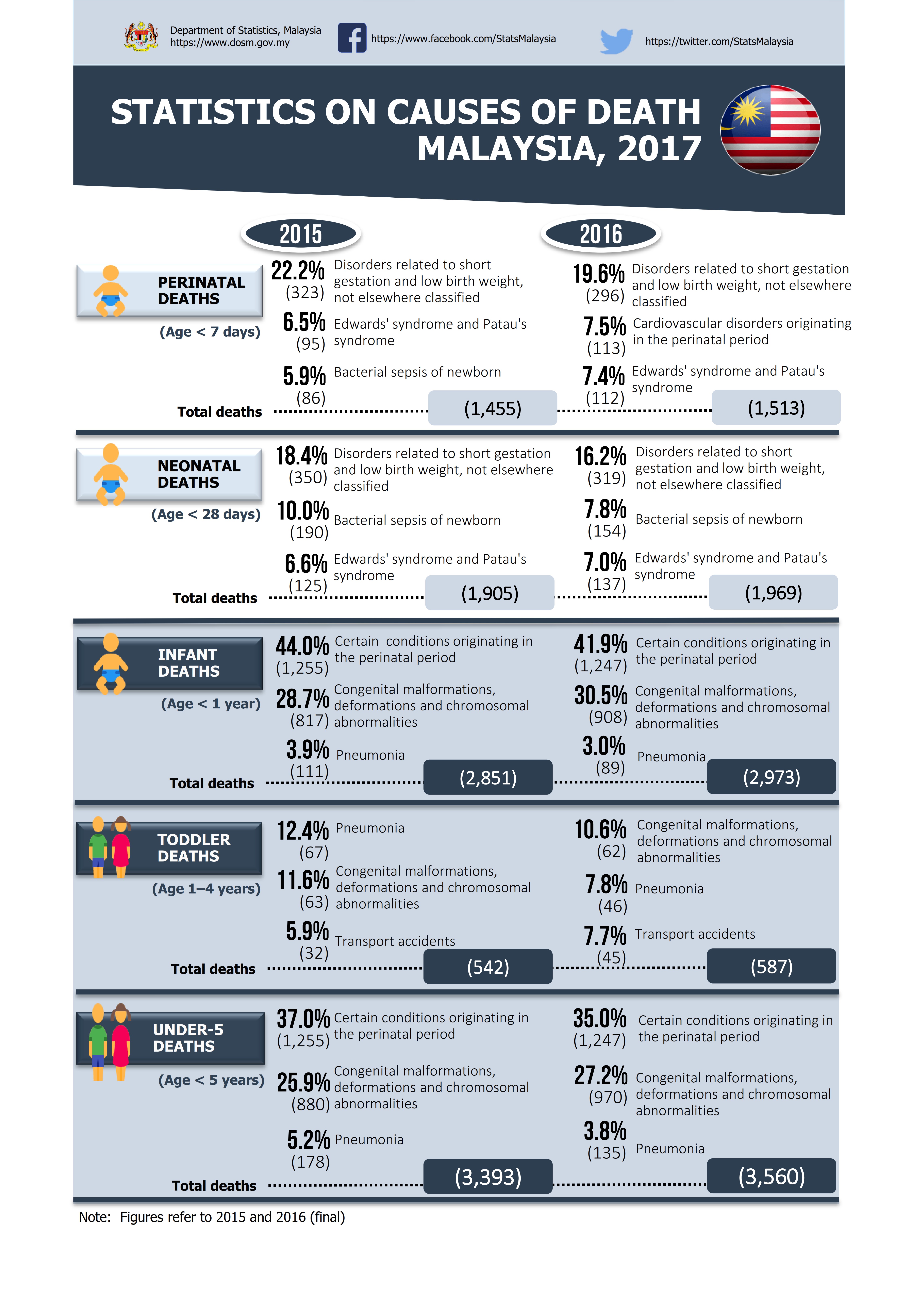 In 2016, deaths due to certain conditions originating in the perinatal period recorded the highest percentage for infants and toddlers aged below five years at 35.0 per cent, followed by congenital malformations, deformations & chromosomal abnormalities (27.2%), pneumonia (3.8%), transport accidents (1.8%) and accidental drowning & submersion (1.1%).