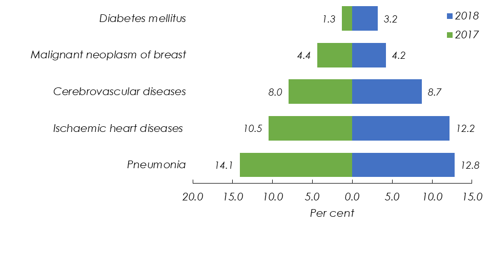 Pneumonia remained as the principal causes of death for females at 12.8 per cent, followed by Ischaemic heart diseases (12.2%), Cerebrovascular diseases (8.7%) and Malignant neoplasm of breast (4.2%) and Diabetes mellitus (3.2%). Diabetes mellitus was the fifth causes of death as compared to tenth place in 2017.