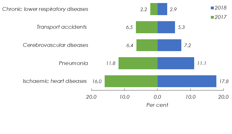 The principal causes of death in urban and rural areas in 2018 were Ischaemic heart diseases, recorded 15.9 per cent and 15.0 per cent, respectively. In urban area, Ischaemic heart diseases recorded a 1.5 percentage points increase while rural area increased 2.3 percentage points.