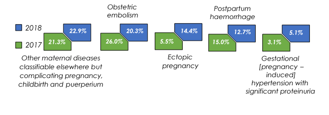 Other maternal diseases classifiable elsewhere but complicating pregnancy, childbirth and puerperium recorded as the principal causes of death for maternal in 2018 of 22.9 per cent followed by Obstetric embolism (20.3%), Ectopic pregnancy (14.4%), Postpartum haemorrhage (12.7%) and Gestational [pregnancy – induced] hypertension with significant proteinuria (5.1%). Obstetric embolism and Postpartum haemorrhage decreased in 2018 as compared to 2017 by 5.7 and 2.3 percentage points, respectively.