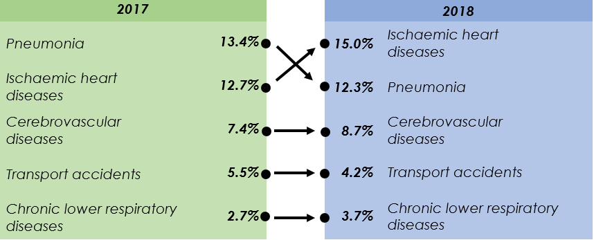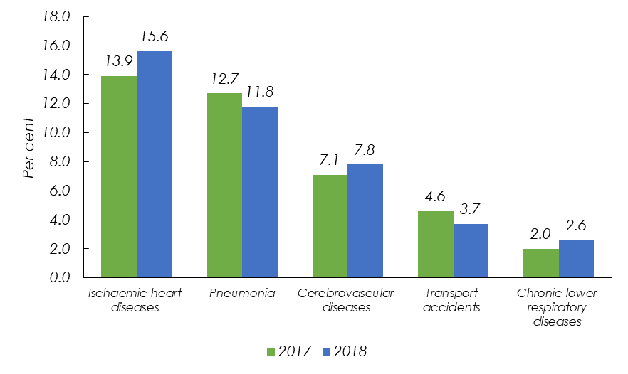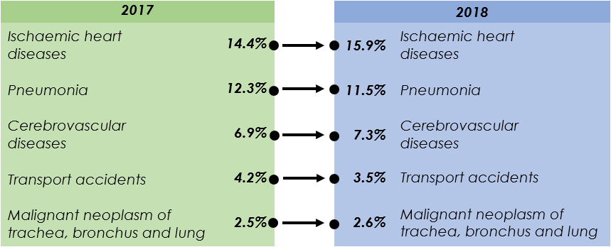 In 2018, Ischaemic heart diseases remained as the principal causes of death for males (17.8%). This is followed by Pneumonia (11.1%), Cerebrovascular diseases (7.2%), Transport accidents (5.3%) and Chronic lower respiratory diseases (2.9%). Cerebrovascular diseases was the third highest causes of death as compared to fourth place in 2017.