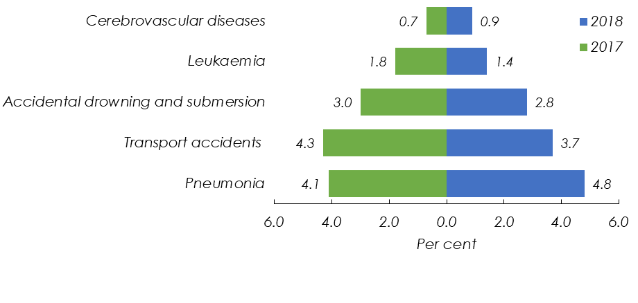 Pneumonia was the principal causes of death for population aged 0 to 14 years in 2018 at 4.8 per cent followed by Transport accidents (3.7%), Accidental drowning and submersion (2.8%), Leukaemia (1.4%) and Cerebrovascular diseases (0.9%). Pneumonia recorded the highest change in 2018 as compared to 2017 of 0.7 percentage point.