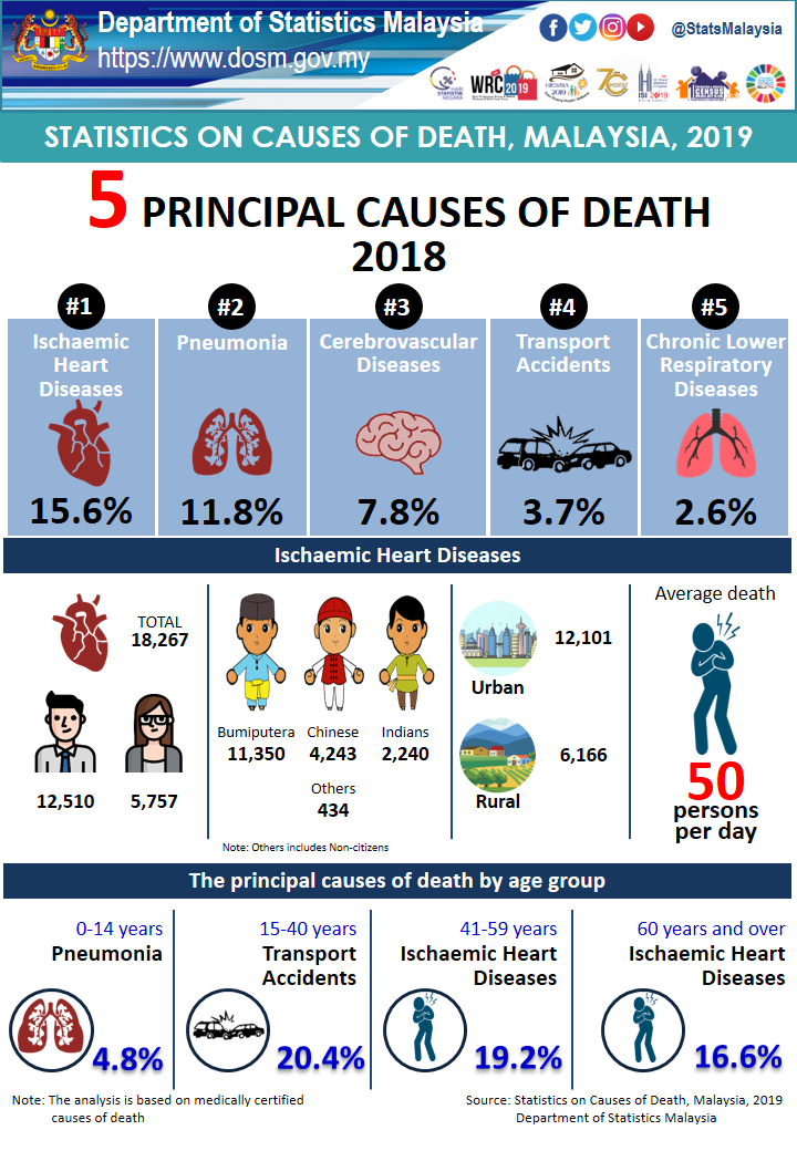 Ischaemic heart diseases remained as the principal causes of death for Bumiputera at 15.2 per cent, followed by Pneumonia (11.9%), Cerebrovascular diseases (8.3%), Transport accidents (4.0%) and Chronic lower respiratory diseases (3.0%). Pneumonia and Transport accidents decreased in 2018 by 1.1 and 1.2 percentage points, respectively.