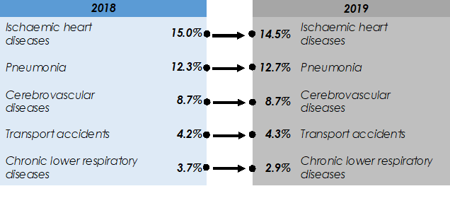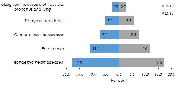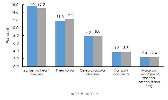 Ischaemic heart diseases remained as the principal causes of death, 15.0 per cent of the 109,164 medically certified deaths in 2019. This was followed by Pneumonia (12.2%), Cerebrovascular diseases (8.0%), Transport accidents (3.8%) and Malignant neoplasm of trachea, bronchus and lung (2.4%).