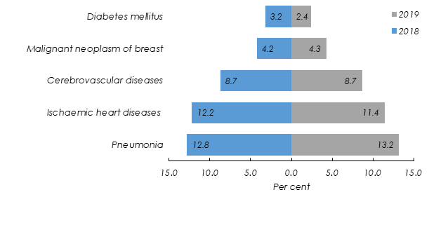 Pneumonia remained as the principal causes of death for females at 13.2 per cent, followed by Ischaemic heart diseases (11.4%), Cerebrovascular diseases (8.7%), Malignant neoplasm of breast (4.3%) and Diabetes mellitus (2.4%).