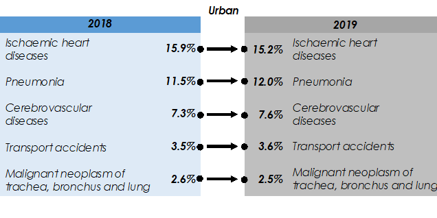 The principal causes of death in urban and rural areas in 2019 was Ischaemic heart diseases, recorded 15.2 per cent and 14.5 per cent, respectively.