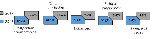 Postpartum haemorrhage was recorded as the principal causes of death for maternal in 2019 at 17.5 per cent followed by Obstetric embolism (12.6%), Eclampsia (9.7%), Ectopic pregnancy (5.8%) and Puerperal sepsis (5.8%).