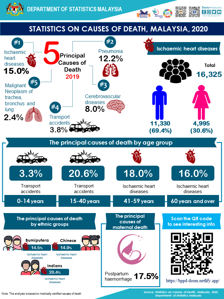 Ischaemic heart diseases remained as the principal causes of death for Bumiputera at 14.5 per cent, followed by Pneumonia (12.4%), Cerebrovascular diseases (8.4%), Transport accidents (4.3%) and Chronic lower respiratory diseases (2.4%).