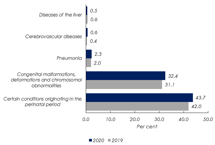 Certain conditions originating in the perinatal period remained as the principal causes of death for infant in 2020 at 43.7 per cent followed by Congenital malformations, deformations and chromosomal abnormalities (32.4%), Pneumonia (2.3%), Cerebrovascular diseases (0.6%) and Diseases of the liver (0.5%).
