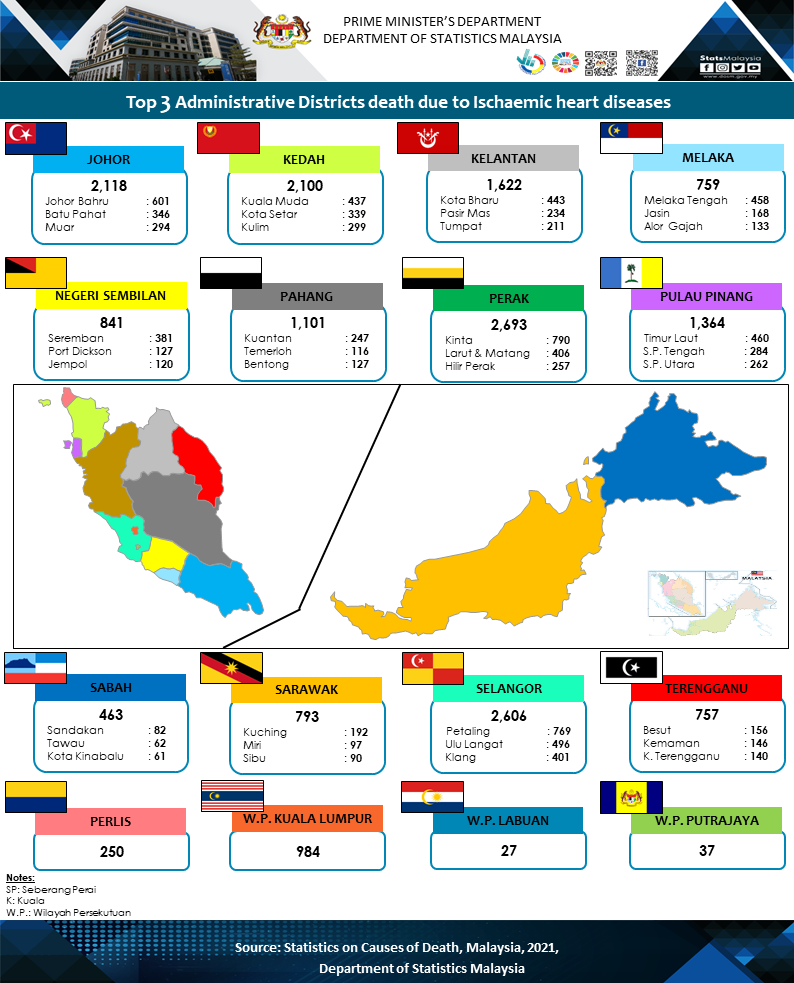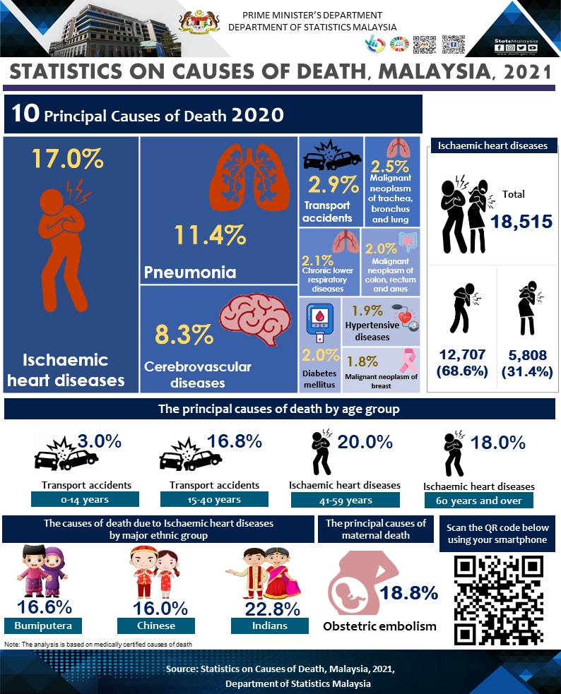 Ischaemic heart diseases remained as the principal causes of death for Bumiputera at 16.6 per cent of the 69,612 medically certified deaths in 2020. This was followed by Pneumonia (11.1%), Cerebrovascular diseases (9.1%), Transport accidents (3.2%) and Chronic lower respiratory diseases (2.4%).