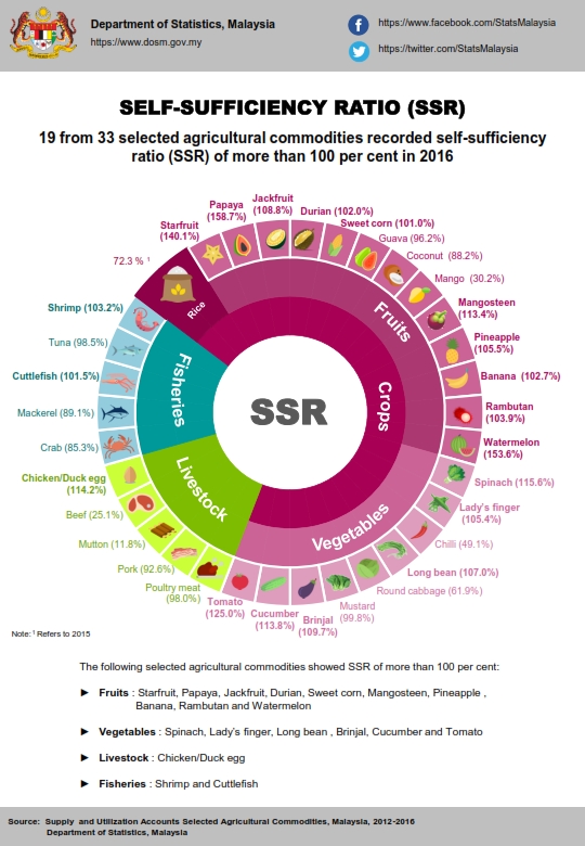 Selected agricultural commodities are divided into three categories namely selected crops, (fruits and vegetables), selected livestock and selected fisheries. In 2016, a total of 33 commodities were covered and 19 of them recorded self-sufficiency ratio (SSR) of more than 100 per cent.