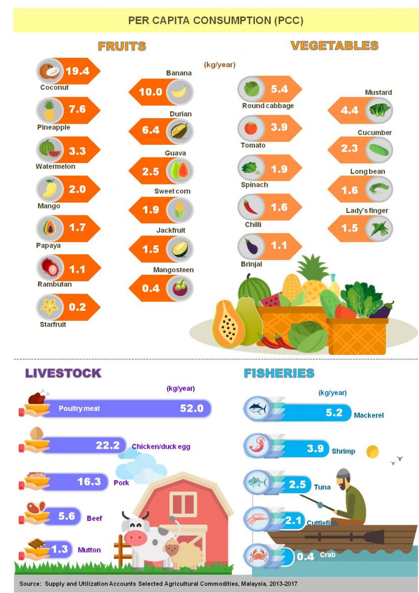 Seven (7) out of 13 fruits recorded SSR more than 100 per cent. Watermelon with 151.7 per cent recorded the highest SSR followed by papaya (143.6%) and starfruit (136.0%). Per capita consumption (PCC) of coconut was the highest (19.4 kg/year) followed by banana (10.0 kg/year), pineapple (7.6 kg/year) and durian (6.4 kg/year).
