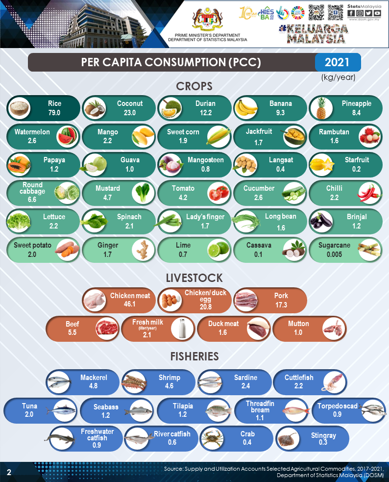 The full publication of the Supply and Utilization Accounts Selected Agricultural Commodities, Malaysia 2017-2021 can be downloaded through eStatistik portal.