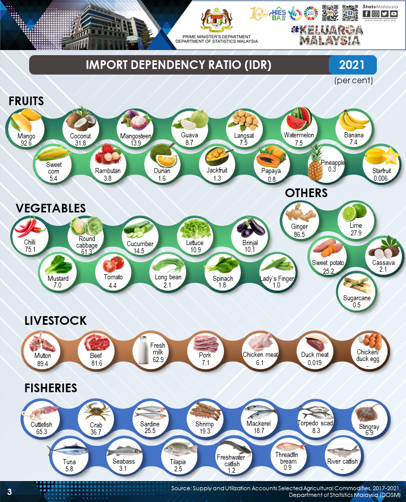 The compilation of SUA encompasses the selected agricultural commodities refers to three categories, namely crops (fruits, vegetables and others), livestock and fisheries. In 2021, a total of 50 agricultural commodities was covered and 26 of them recorded self-sufficiency ratio (SSR) more than 100.0 per cent.