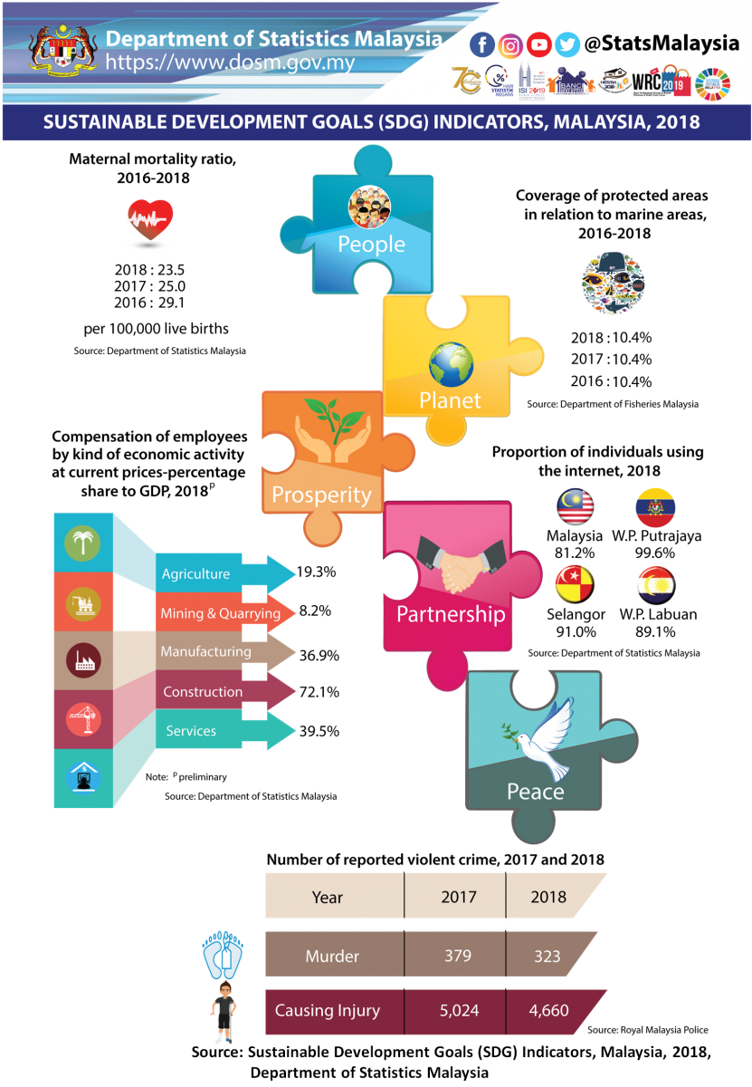 Sustainable Development Goals (SDG) Indicators, Malaysia, 2018 is the first report of SDG Indicators subsequent to the publication of The Initial Assessment of Sustainable Development Goals Indicators for Malaysia 2018 which was published in December 2018. Sustainable Development Goals (SDG) Indicators, Malaysia, 2018 highlights the national progress being made towards the 2030 Agenda. The report presents the internationally agreed targets and indicators according to availability of data.