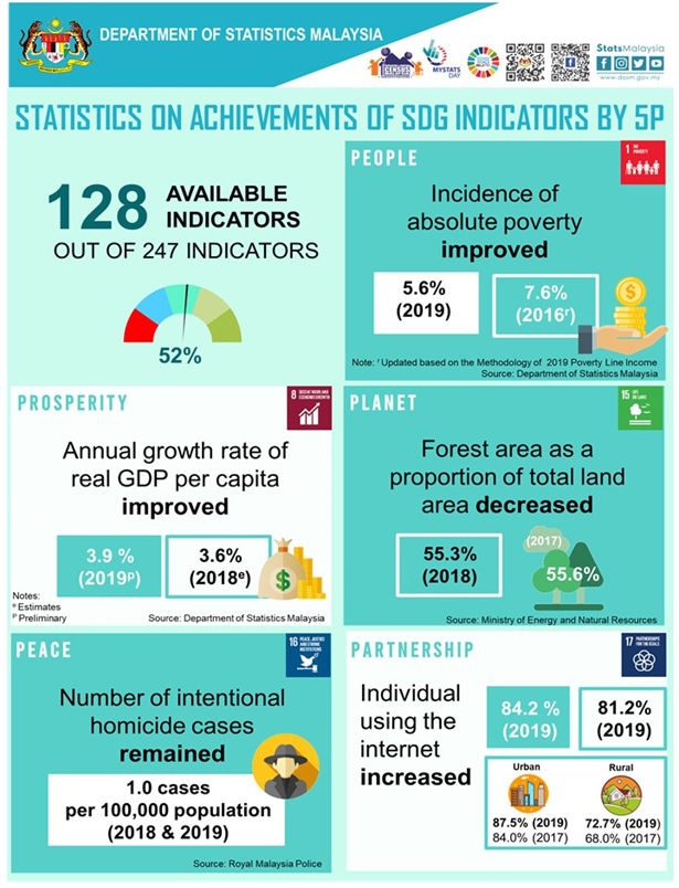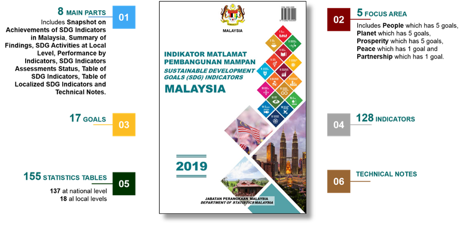 Sustainable Development Goals (SDG) Indicators, Malaysia, 2019 is the second report that presents the performance of indicators available at Malaysia levels. For the first time, this report is published in bilingual Malay-English and consists of 18 indicators at local levels. This publication comprises of 128 (52%) available indicators out of 247 global indicators. This report highlights the national progress of SDG indicators development towards achieving 2030 Agenda. The development of indicators indicates a progress with Goal 3 has achieved 86 per cent of data availability followed by Goal 9 (83%) and Goal 4 (75%). SDG integrates and balance the five focus areas namely People, Planet, Prosperity, Peace and Partnership.