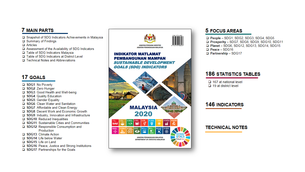 The Sustainable Development Goals (SDG) Indicators, Malaysia, 2020 is the third report published by DOSM which comprises of 146 indicators out of 247 global indicators. The development of indicators for 2020 has improved with 59 per cent available indicators as compared to 52 per cent in 2019. This improvement is fully supported by the cooperation and coordination from agencies and ministries. SDG integrates the five focus areas namely People, Planet, Prosperity, Peace and Partnership (5P). The COVID-19 pandemic has resulted in considerable changes to the 5P as well as three dimensions of sustainable development namely social, economy and environment, thus, become a major challenge in monitoring the SDG performance.