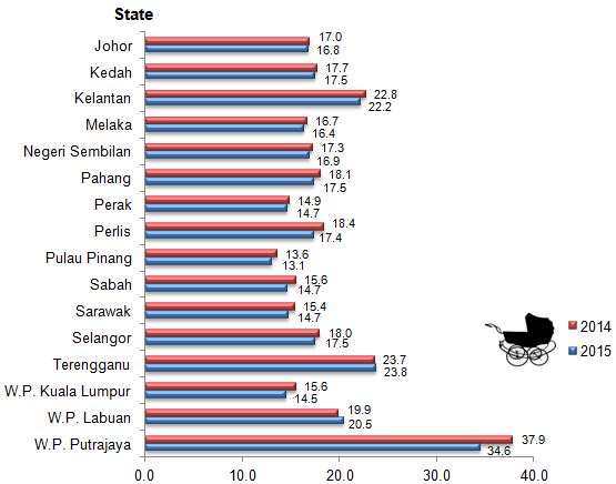 The crude birth rate declined in all states except Terengganu and W.P. Labuan. In 2015, W. P. Putrajaya recorded the highest crude birth rate of 34.6 per 1,000 population, while Pulau Pinang recorded the lowest rate of 13.1 per 1,000 population (Chart 1).