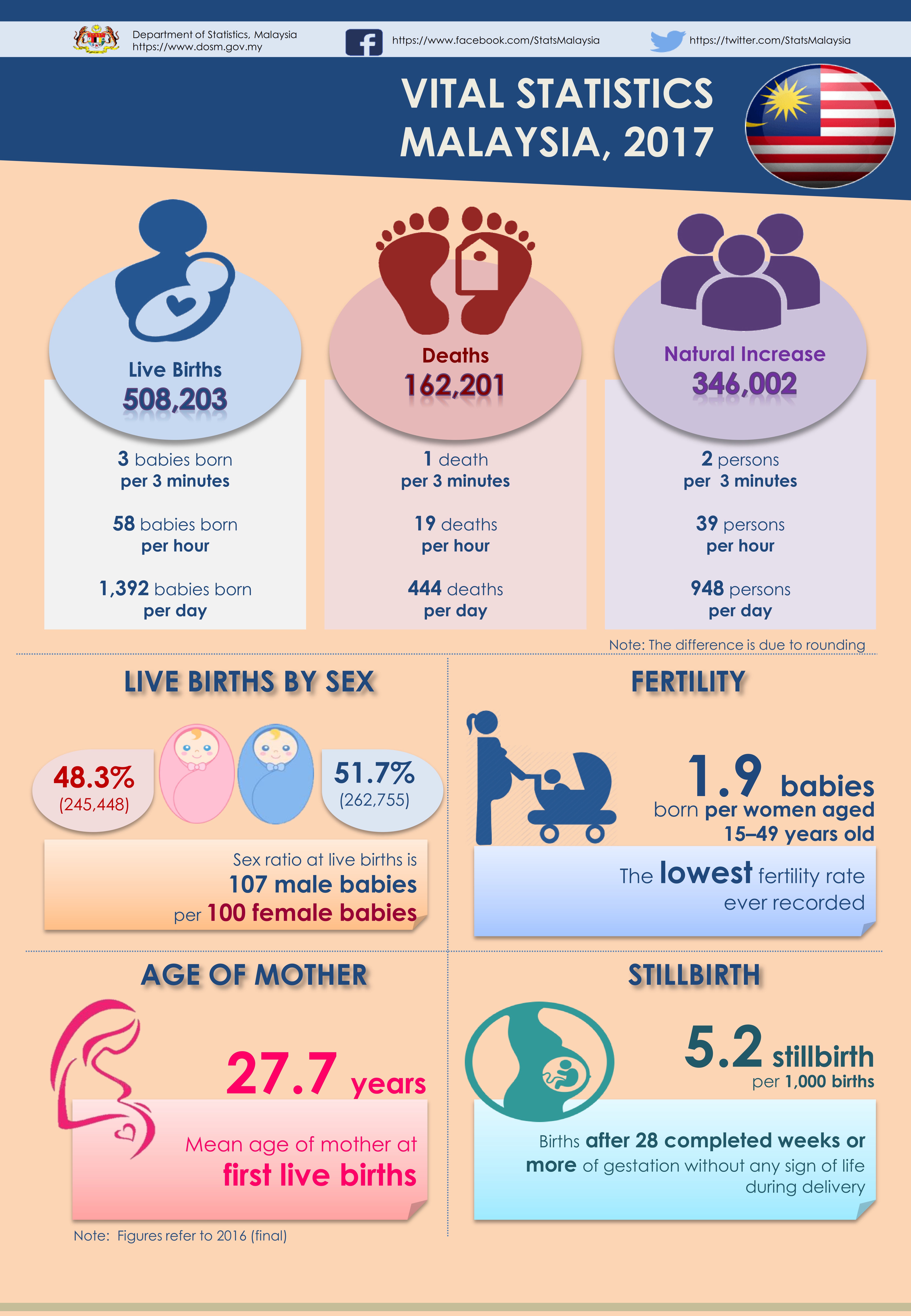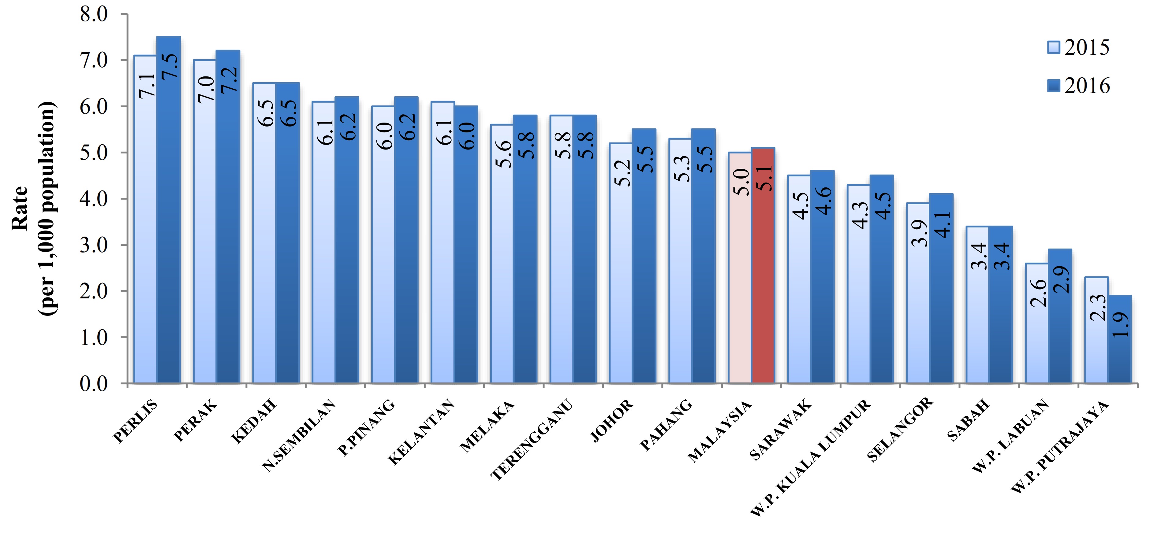 The highest crude birth rate by state in 2016 was recorded by W.P. Putrajaya (30.4) while the lowest was Pulau Pinang at 12.7 per 1,000 population.