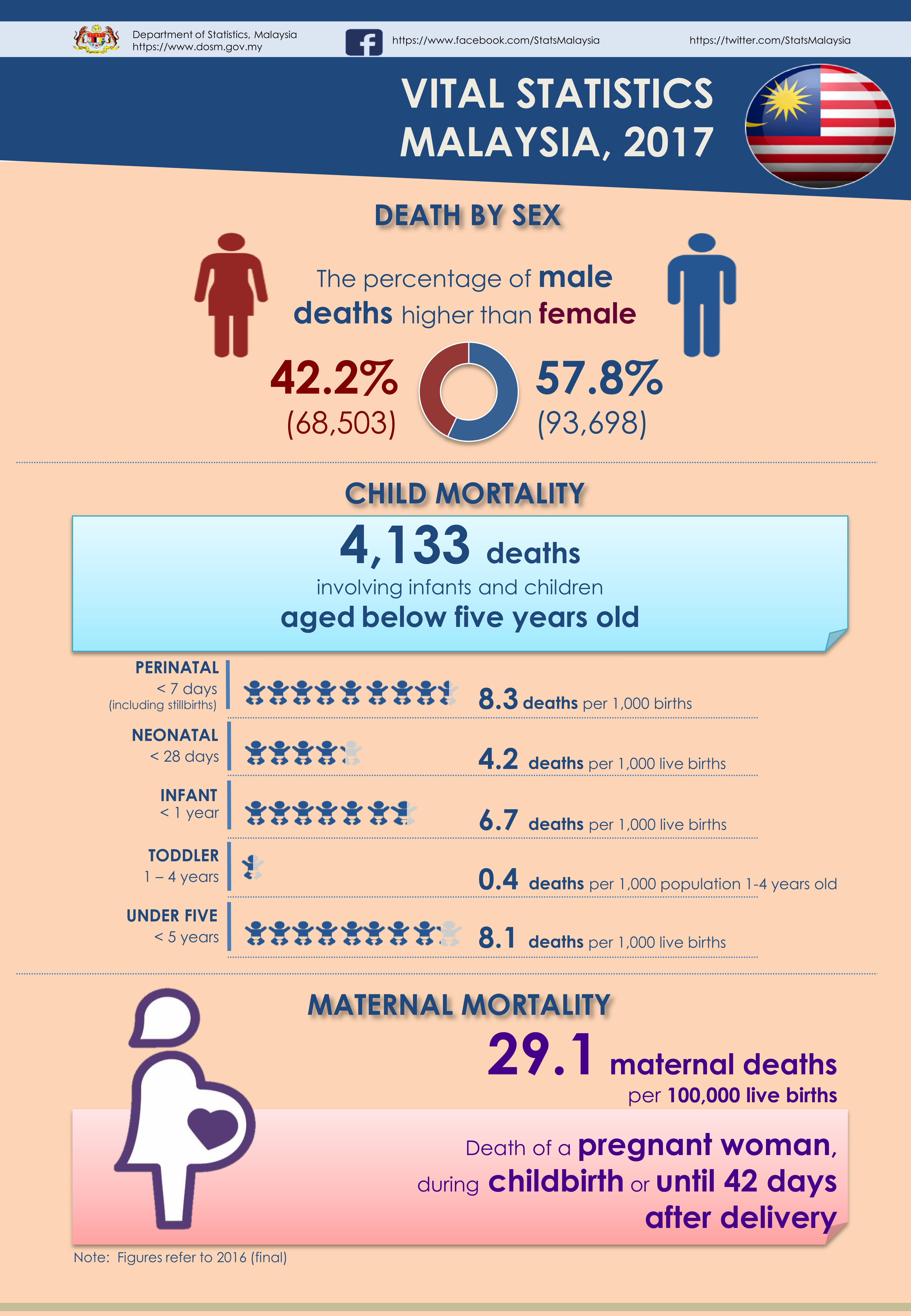 The highest crude death rate by state was recorded by Perlis at 7.5 while the lowest was W.P. Putrajaya at 1.9 per 1,000 population.