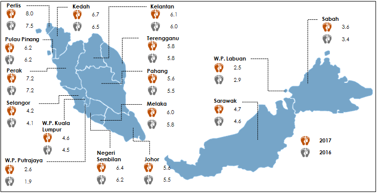 Exhibit 1: Crude birth rate by state, Malaysia, 2016 and 2017