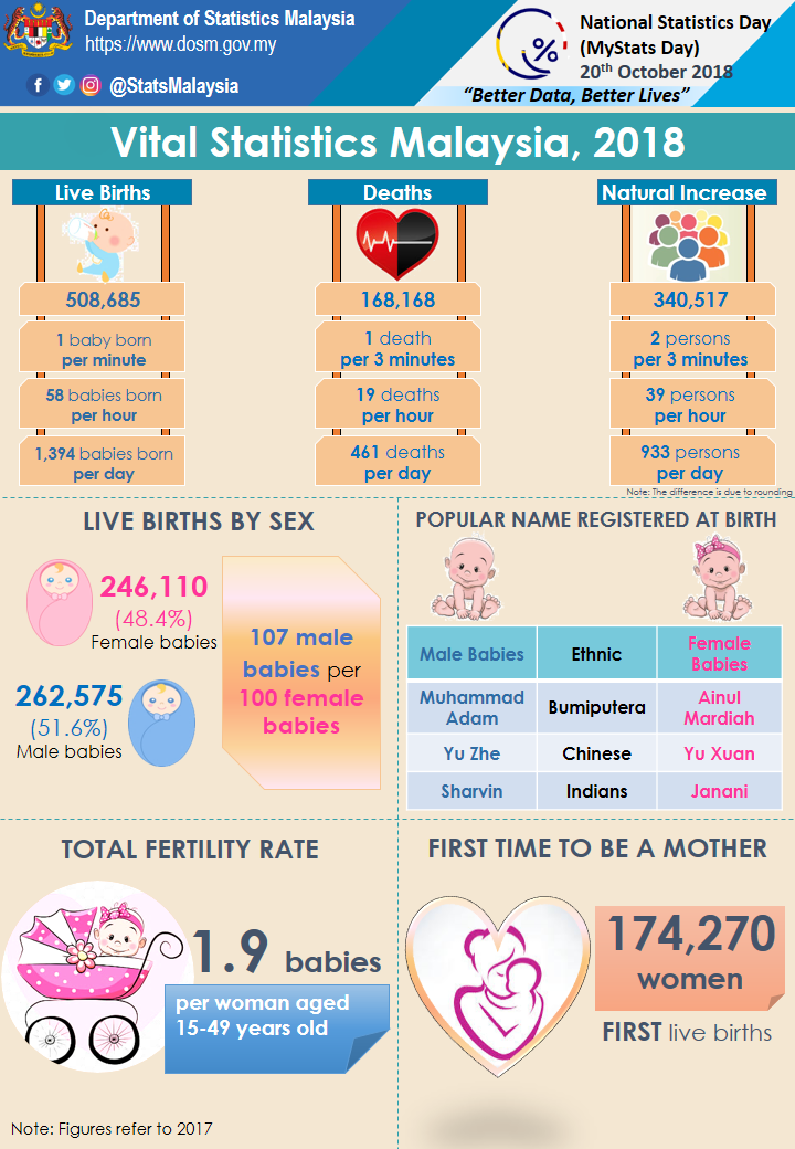 The district of Kuala Terengganu recorded the highest CBR in 2017 with 26.4 per 1,000 population, followed by Marang, Terengganu (26.0) and Julau, Sarawak (24.7). Meanwhile, Kinabatangan, Sabah recorded the lowest crude birth rate of 4.5 per 1,000 population, followed by Putatan, Sabah (5.6) and Pakan, Sarawak (6.4).