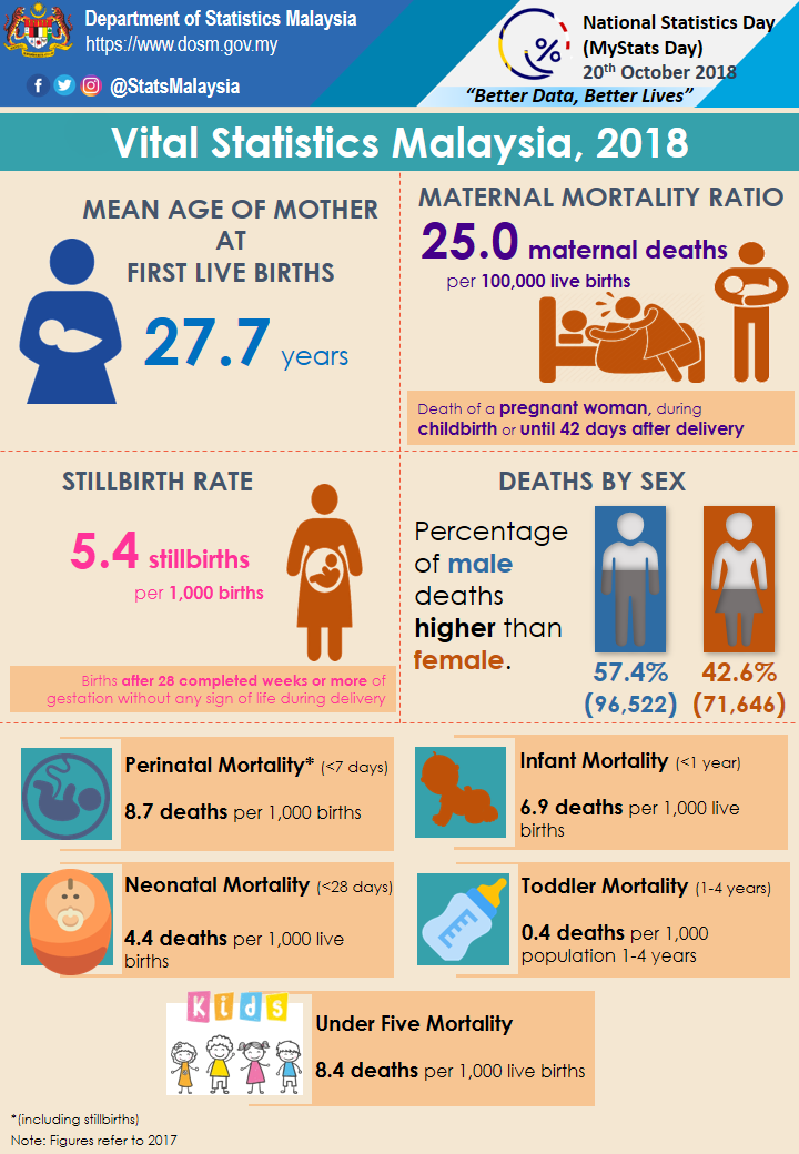 The number of stillbirths in 2017 recorded an increase as compared to 2016 i.e. from 2,648 to 2,769. The stillbirth rate also increased from 5.2 (2016) to 5.4 (2017) per 1,000 births. The number and rate of stillbirths for male babies increased while female decreased during the same period.