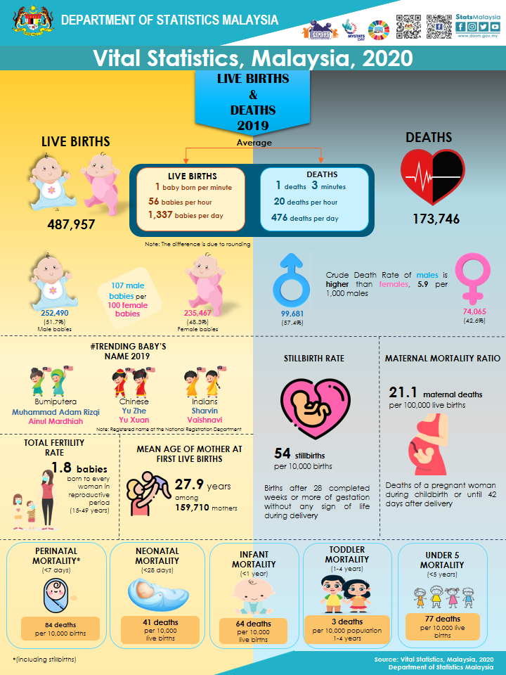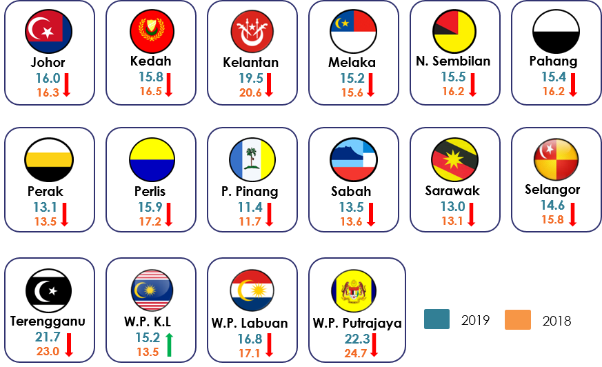 CBR for all states dropped in 2019 as compared to 2018, except for W.P. Kuala Lumpur which increased from 13.5 births per thousand population in 2018 to 15.2 births in 2019. Pulau Pinang continued to record the lowest rate at 11.4 births per thousand population. On the contrary, W.P. Putrajaya registered the highest rate of 22.3 births per thousand population.