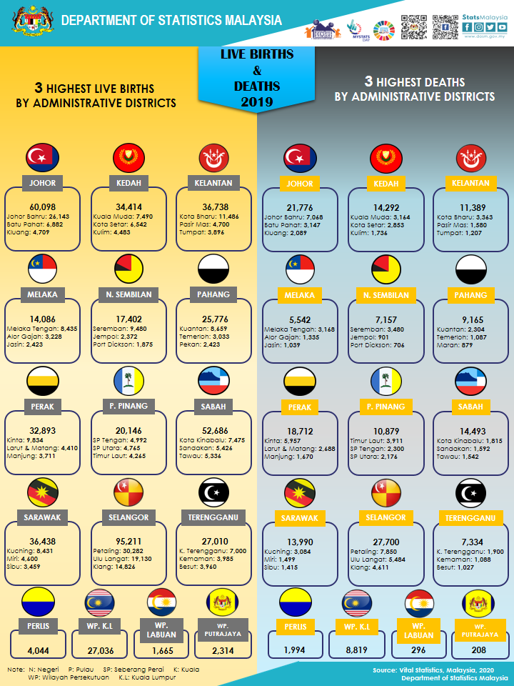 Kanowit, Sarawak recorded the highest CDR in 2019 with 8.9 deaths per thousand population, followed by Kuala Pilah, Negeri Sembilan (8.6) and Kuala Penyu, Sabah (8.4). Meanwhile, the Kinabatangan district in Sabah recorded the lowest CDR with 0.9 deaths per thousand population, followed by Lahad Datu, Sabah (2.2) and Belaga, Sarawak (2.3).
