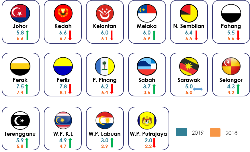 Perlis recorded the highest CDR of 7.8 deaths per thousand population whilst W.P. Putrajaya recorded the lowest rate of 2.0 in 2019.